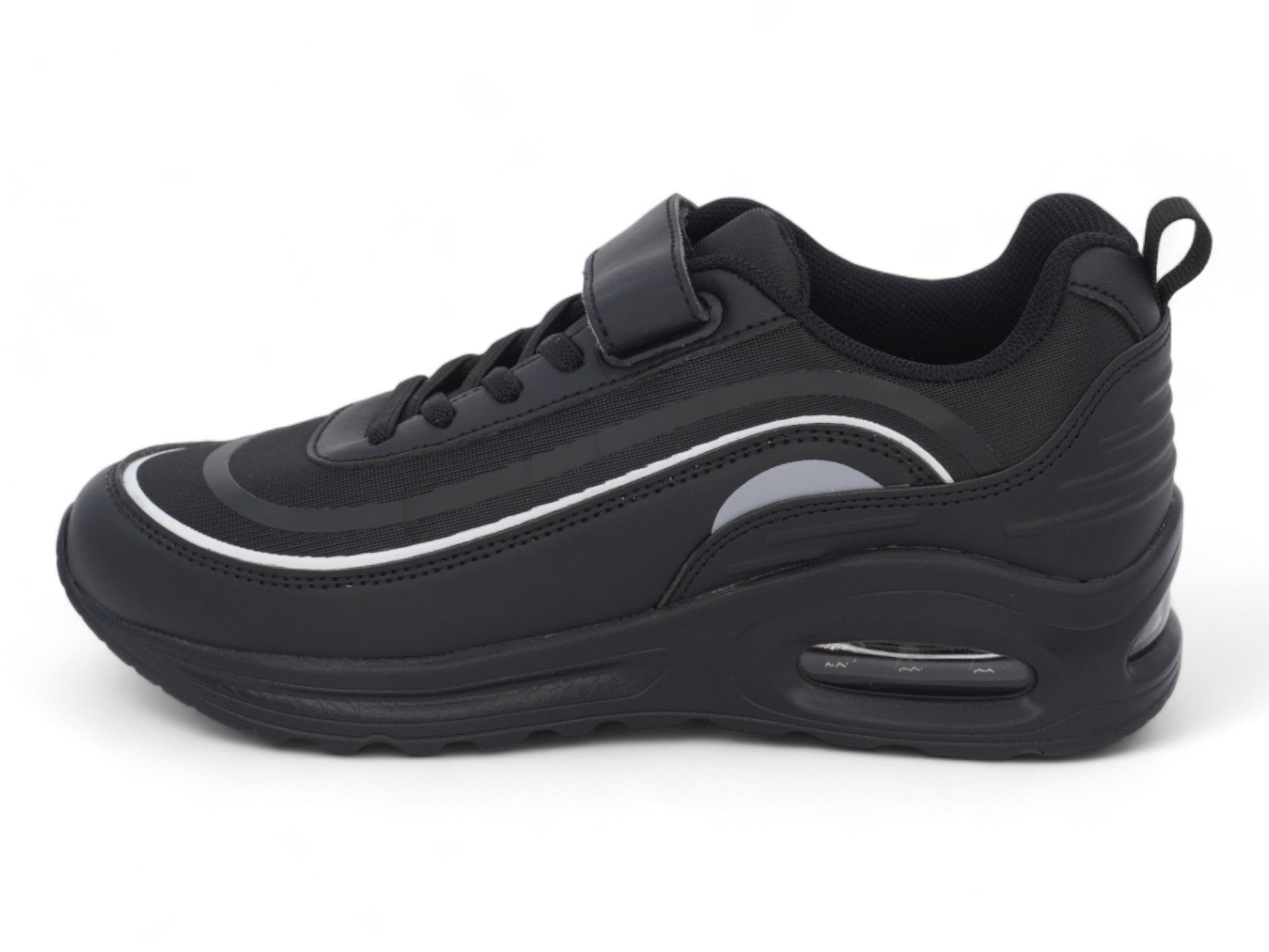 Crafted with breathable black flyknit and durable vegan leather, they offer a lightweight feel and dependable fit. The hook-and-loop velcro strap along with elastic laces ensures quick on-and-off convenience while maintaining a snug, secure fit.