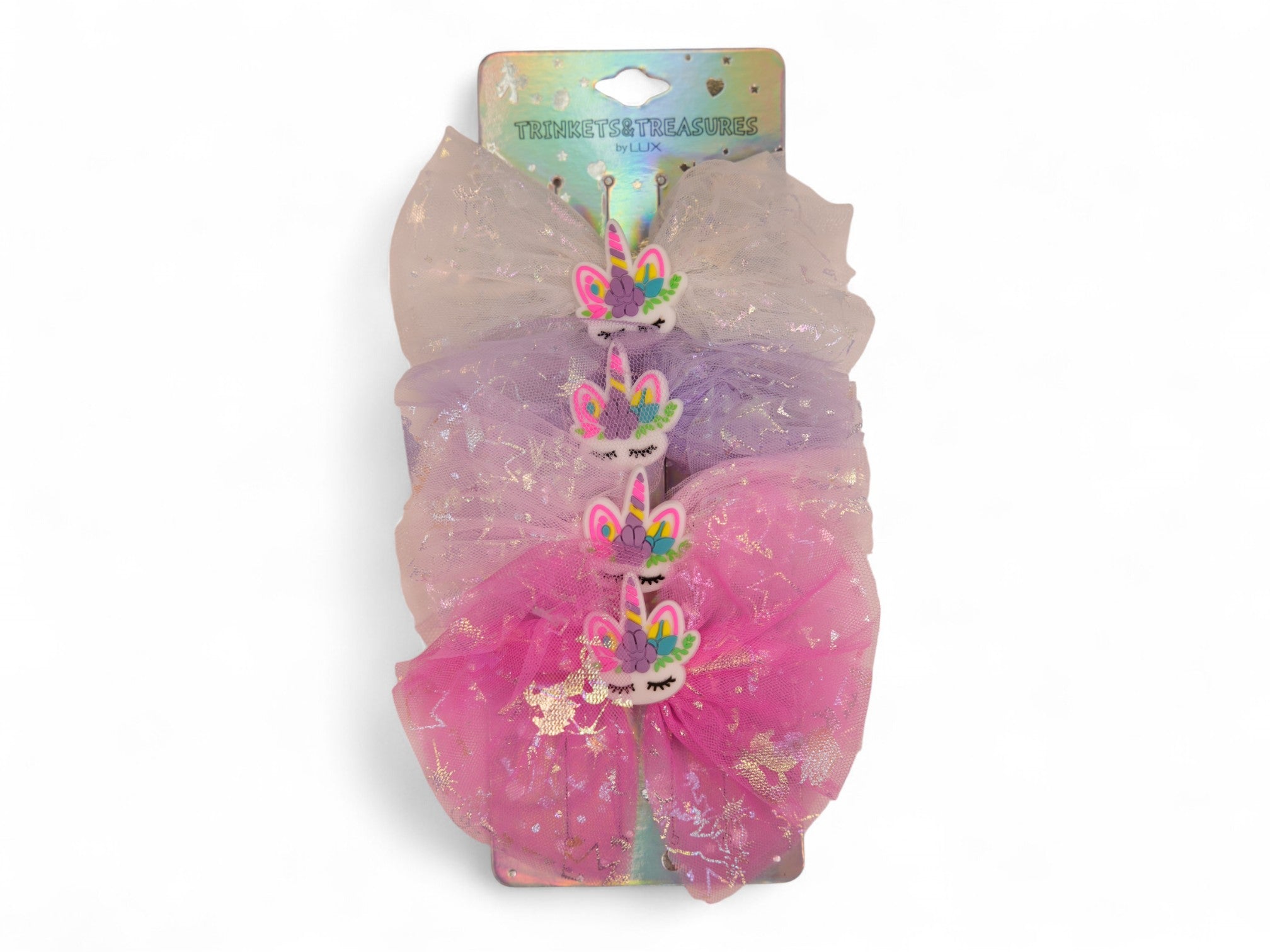Add a magical touch to your little one’s style with our Girl’s Unicorn Bows – 3 Pack. This charming set features three colorful mesh bows, each adorned with a whimsical unicorn embellishment at the center. Delicate shades of pink, purple, and ivory sparkle with subtle glitter, adding a playful yet elegant finish.