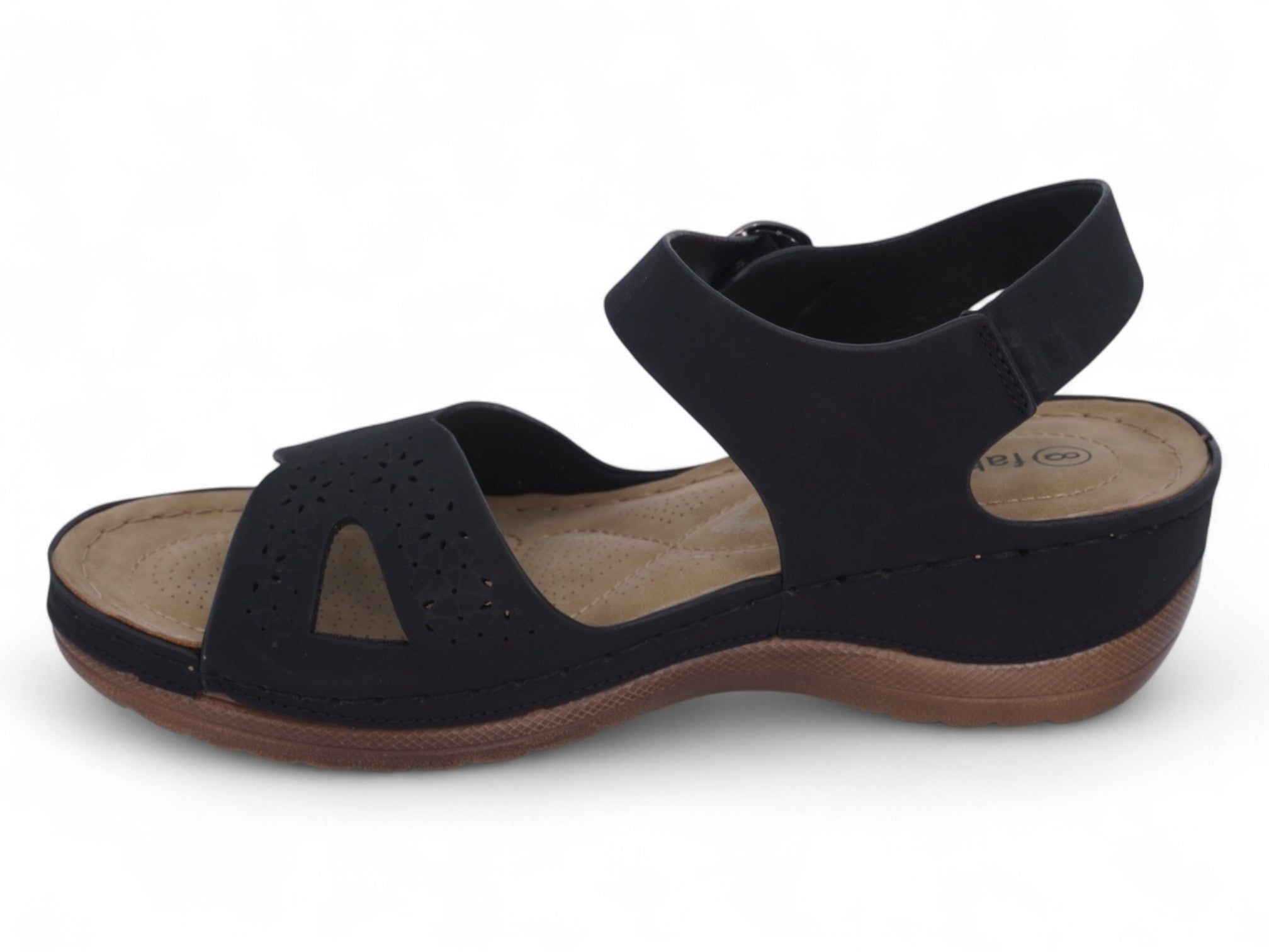 Step into style and comfort with the Women's Black Larissa Comfort Sandal. Crafted with black lasercut faux suede, the upper features an elegant floral cut-out design that adds a touch of sophistication to your warm-weather wardrobe.