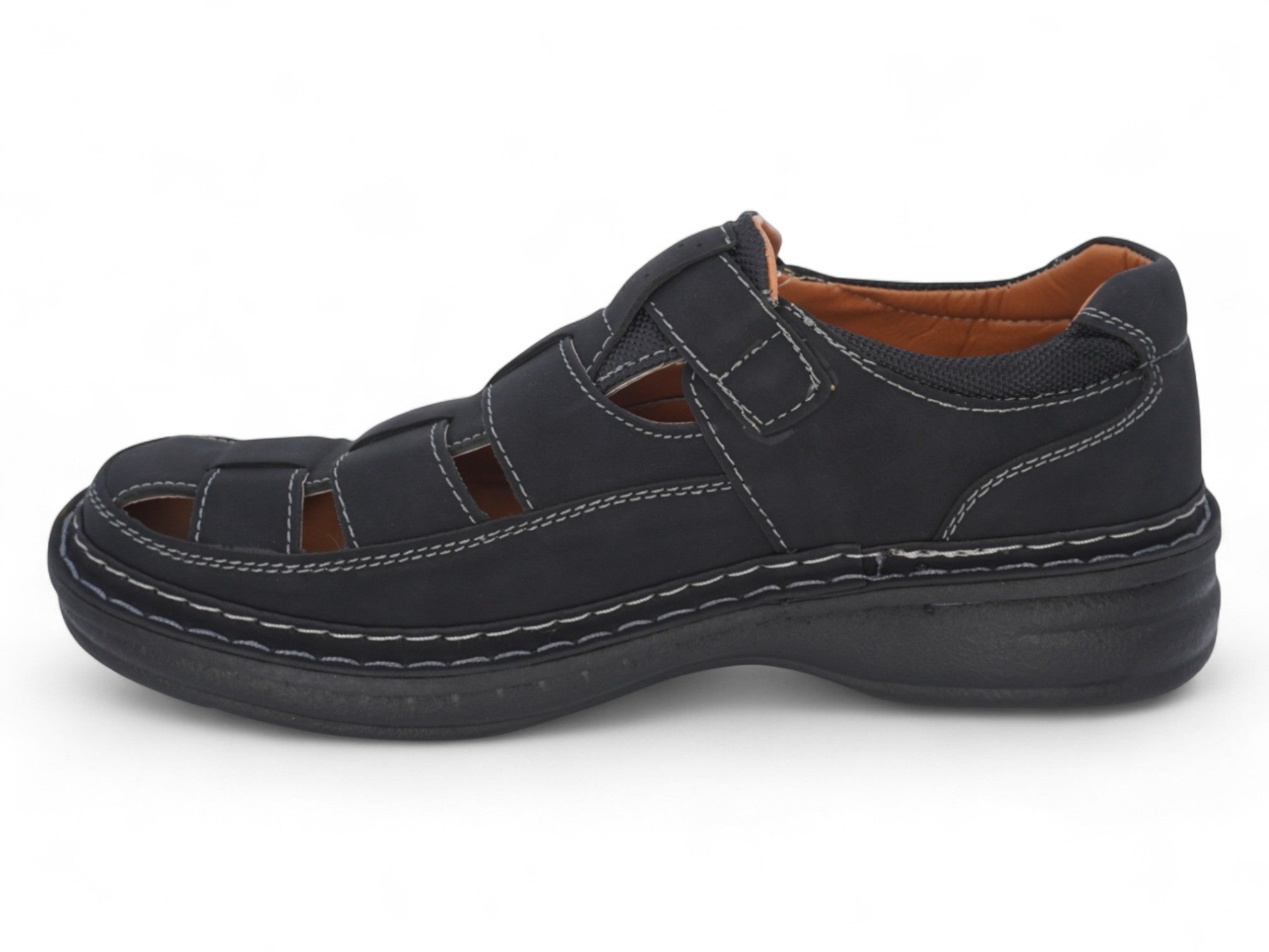 Step into all-day comfort and timeless style with our Men’s Black Fisherman Sandals. Crafted with a classic closed-toe design, these sandals feature a woven faux suede upper with strategically placed cutouts for breathability and a distinctive look. The sleek black color is complemented by contrast white stitching that adds a refined touch.