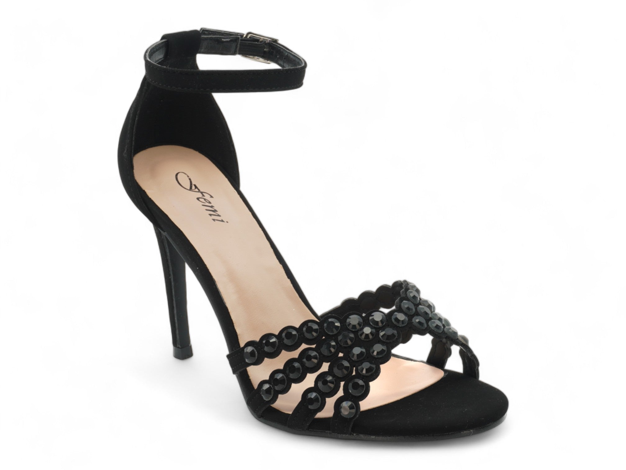 Step into sleek sophistication with the Women's Black Skylar Stiletto. Crafted in rich black nubuck, this high-heeled beauty features an elegant ankle strap for a secure fit and elevated style. The front straps are adorned with black gem embellishments, adding a subtle shimmer that's perfect for evening wear or special occasions.