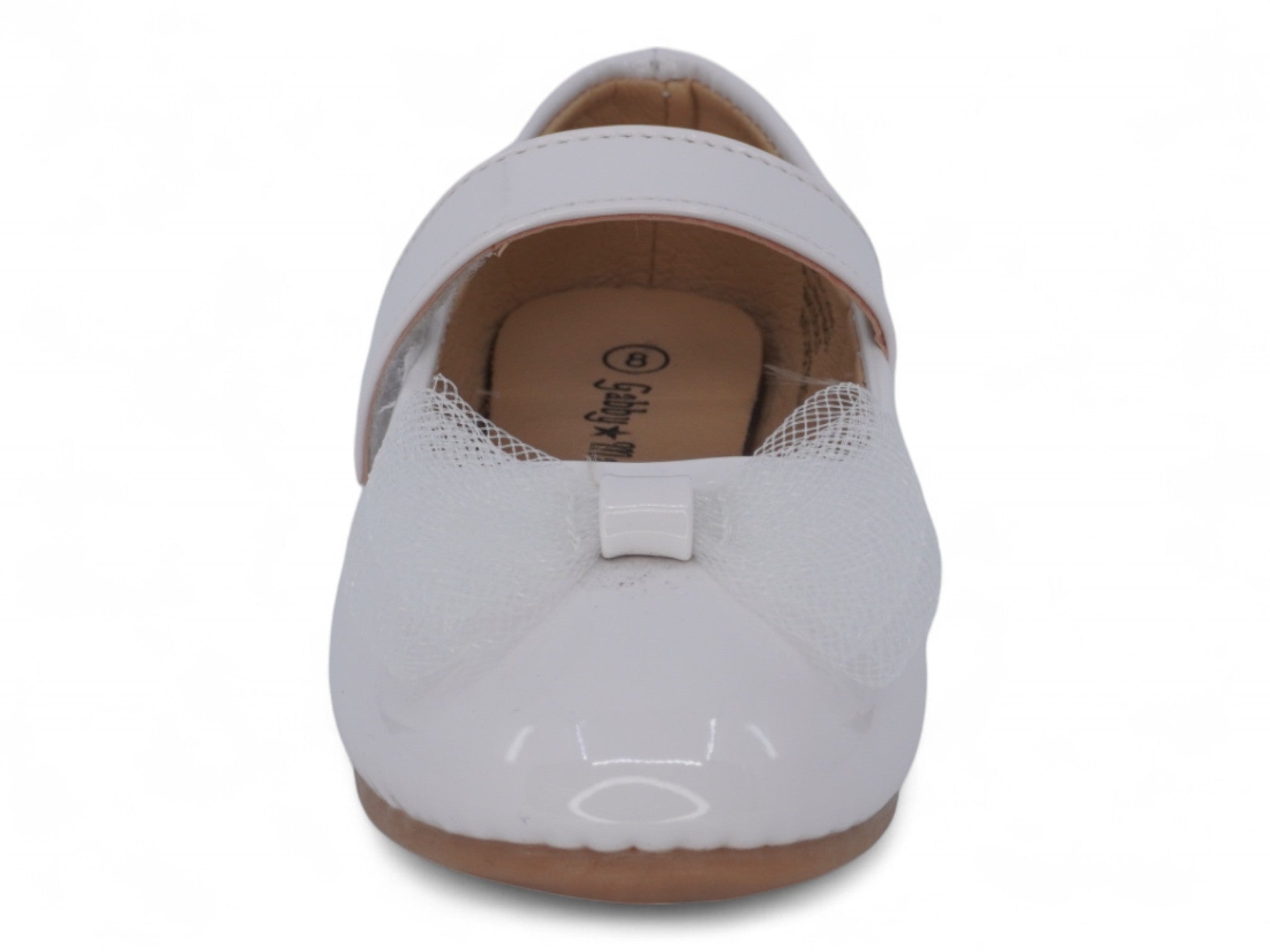 Add a charming touch to her everyday outfit with the Girls' White Patent Sienna Flat. Designed with both style and comfort in mind, this classic white shoe features a glossy patent finish that gives it a subtly polished look—ideal for dressy occasions or everyday wear.