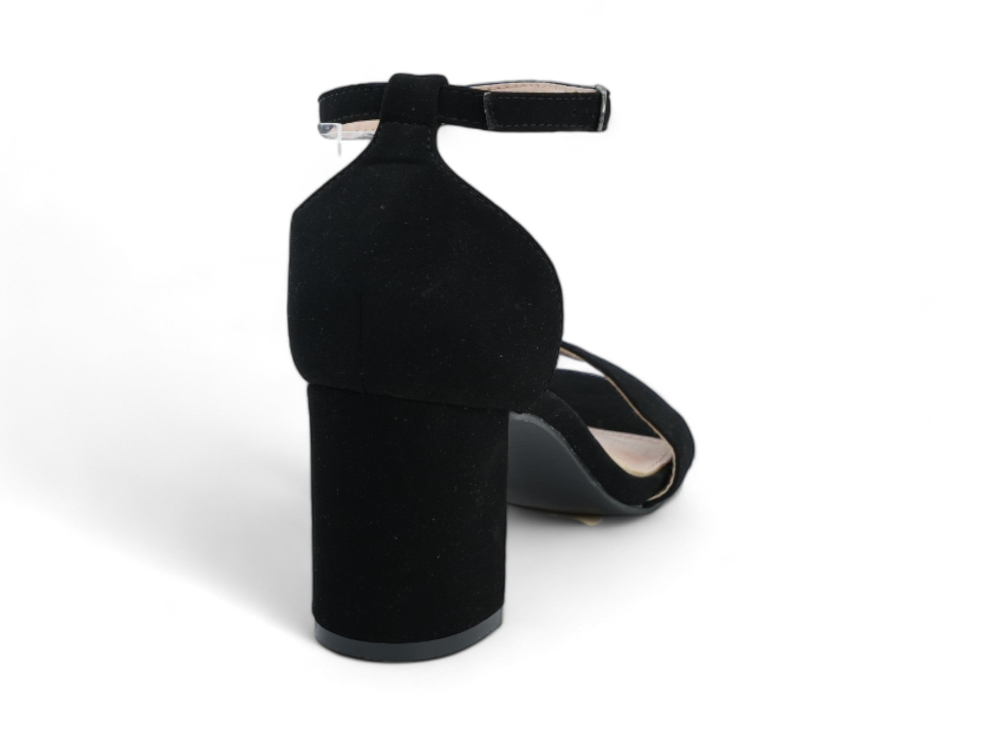 Crafted from soft black faux suede, the minimalist design includes a single strap across the toes and a secure ankle strap. A unique clear section highlights the ankle strap’s closure, adding a contemporary touch. The 3.0-inch chunky heel offers both stability and a stylish lift, while the synthetic insole ensures added comfort with every step.