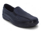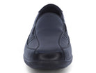 Black vegan leather wide width comfort shoe with elastic side gores for fit.