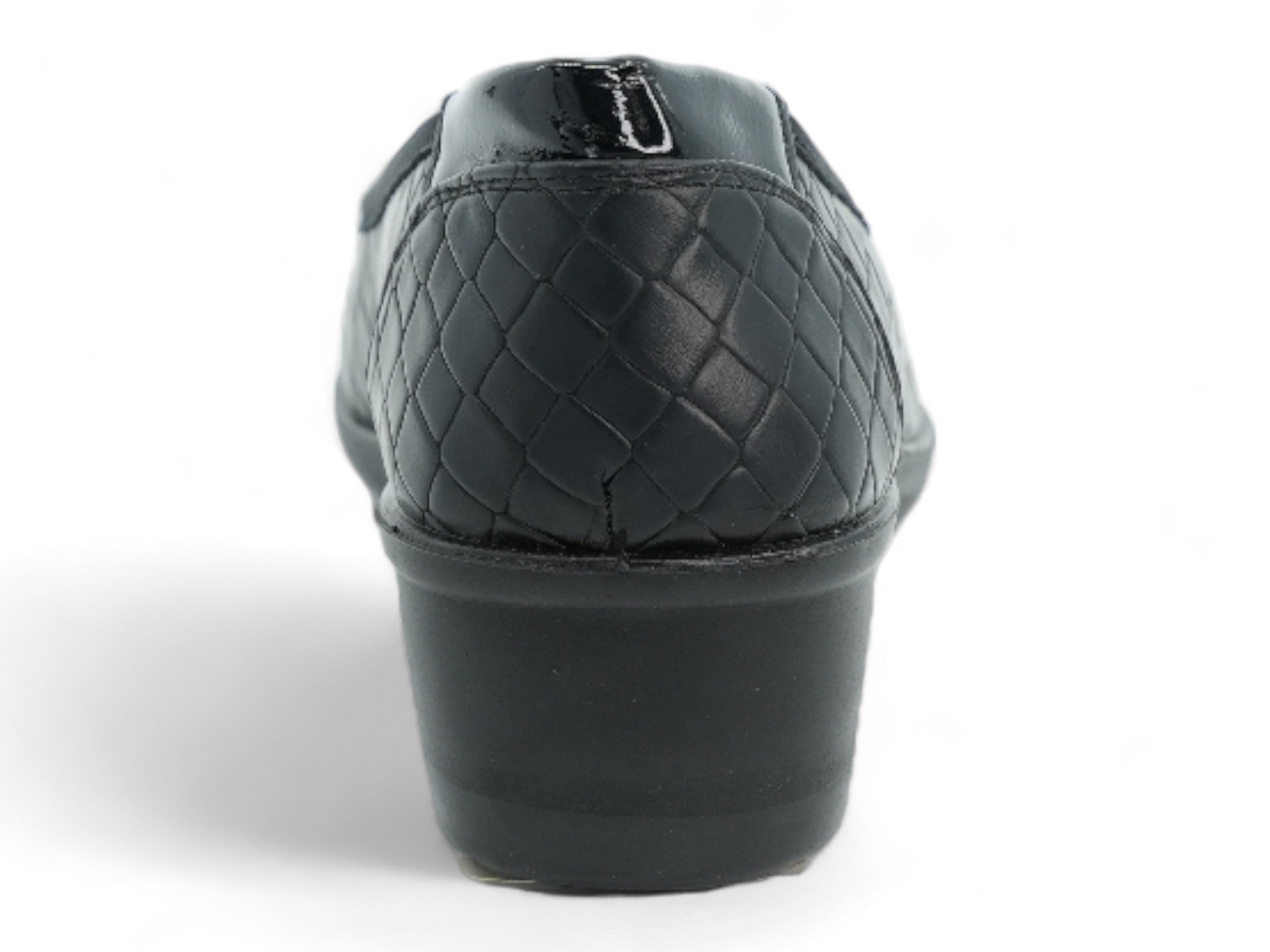 Step into style and comfort with the Women’s Black Elora Wide Width Comfort Wedge. Designed with both elegance and functionality in mind, this sophisticated black wedge features a quilted upper and a glossy patent leather-style toe, creating a chic contrast that elevates any outfit.