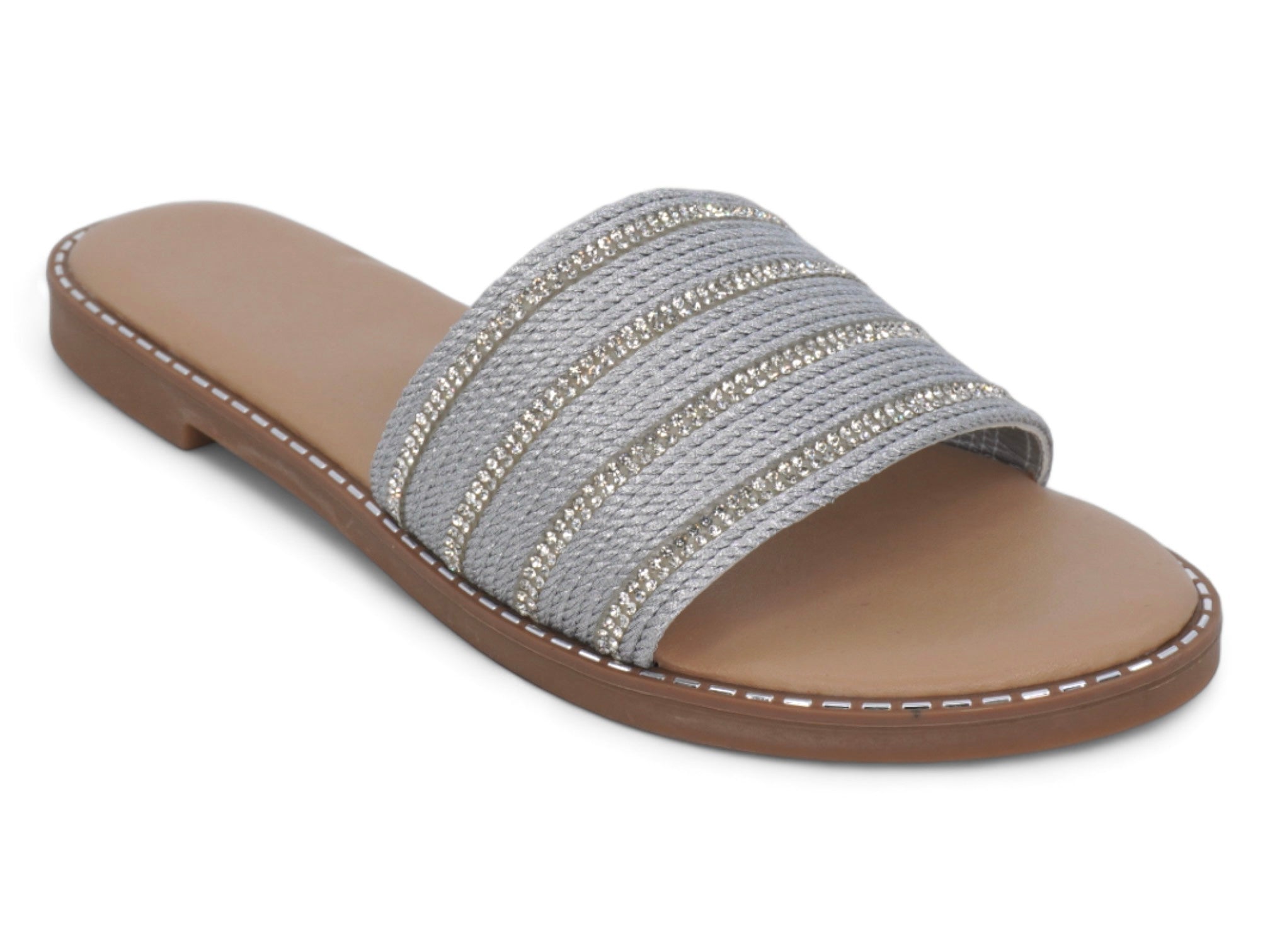 A silver rope detail adorned with dazzling gems enhances the sandal’s stylish appeal, making it ideal for casual outings or dressier occasions. The soft vegan leather insole offers comfort throughout the day, while the durable synthetic outsole is also embellished with subtle gem touches for added flair. Embrace effortless elegance in every stride.