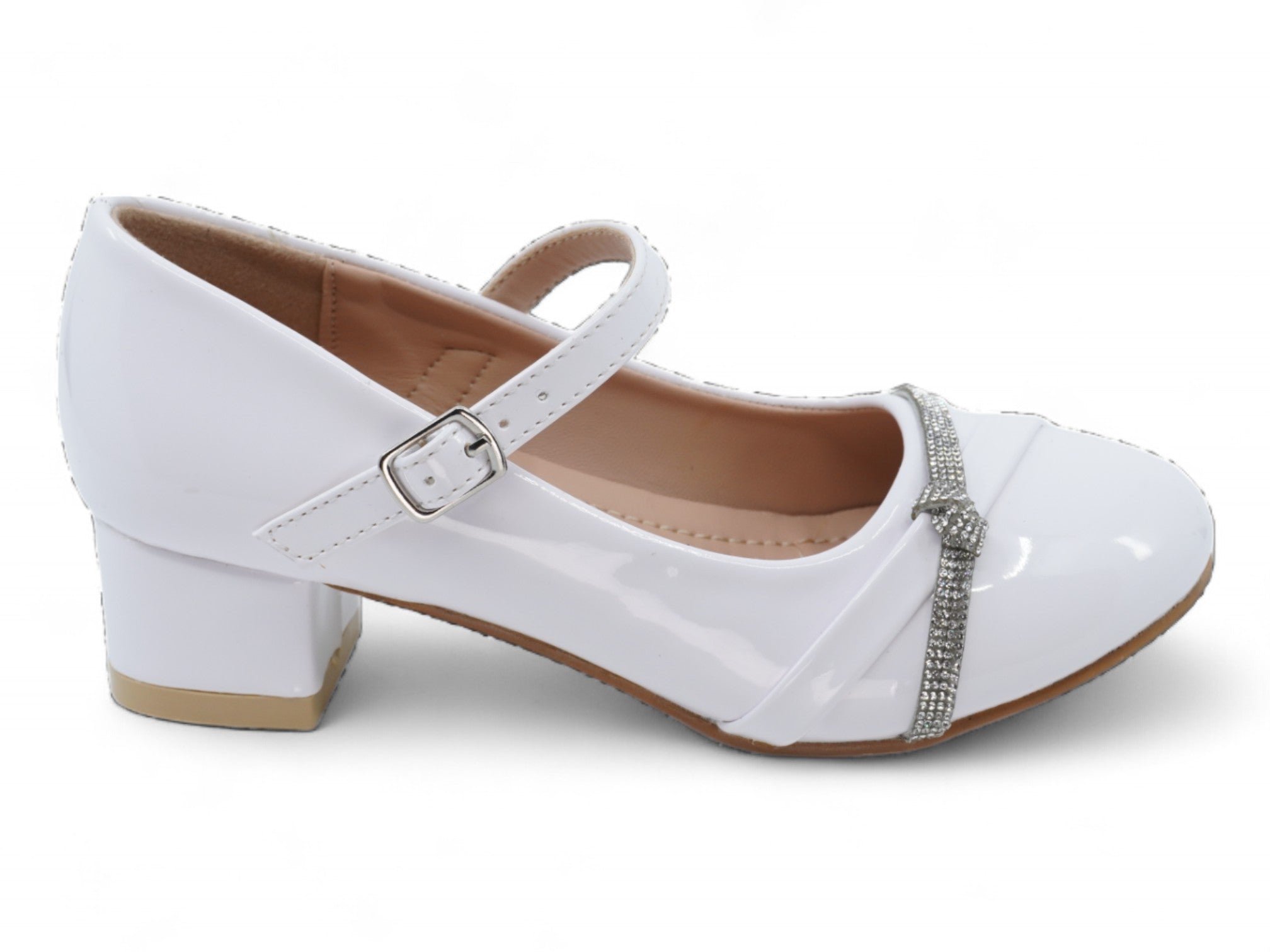 Sumérgete en la elegancia atemporal con el zapato de vestir Marley blanco para niña. Este clásico diseño Mary Jane está confeccionado en charol blanco brillante, creando un look refinado, perfecto para ocasiones especiales, fiestas o eventos formales. El zapato está adornado con una brillante tira plateada en la parte delantera, delicadamente adornada con pedrería que le aporta un toque de brillo y encanto.