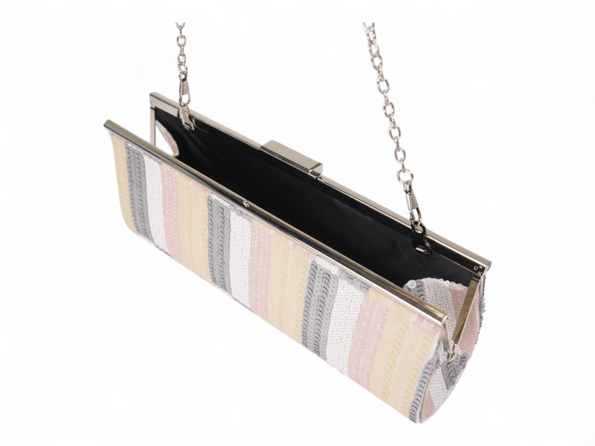 Realza tu look de noche con este llamativo clutch Frame de lentejuelas. Diseñado con un elegante estampado de rayas, luce lentejuelas brillantes en suaves tonos gris, plateado y rosa pálido, que le dan un toque sofisticado y divertido a tu look.
