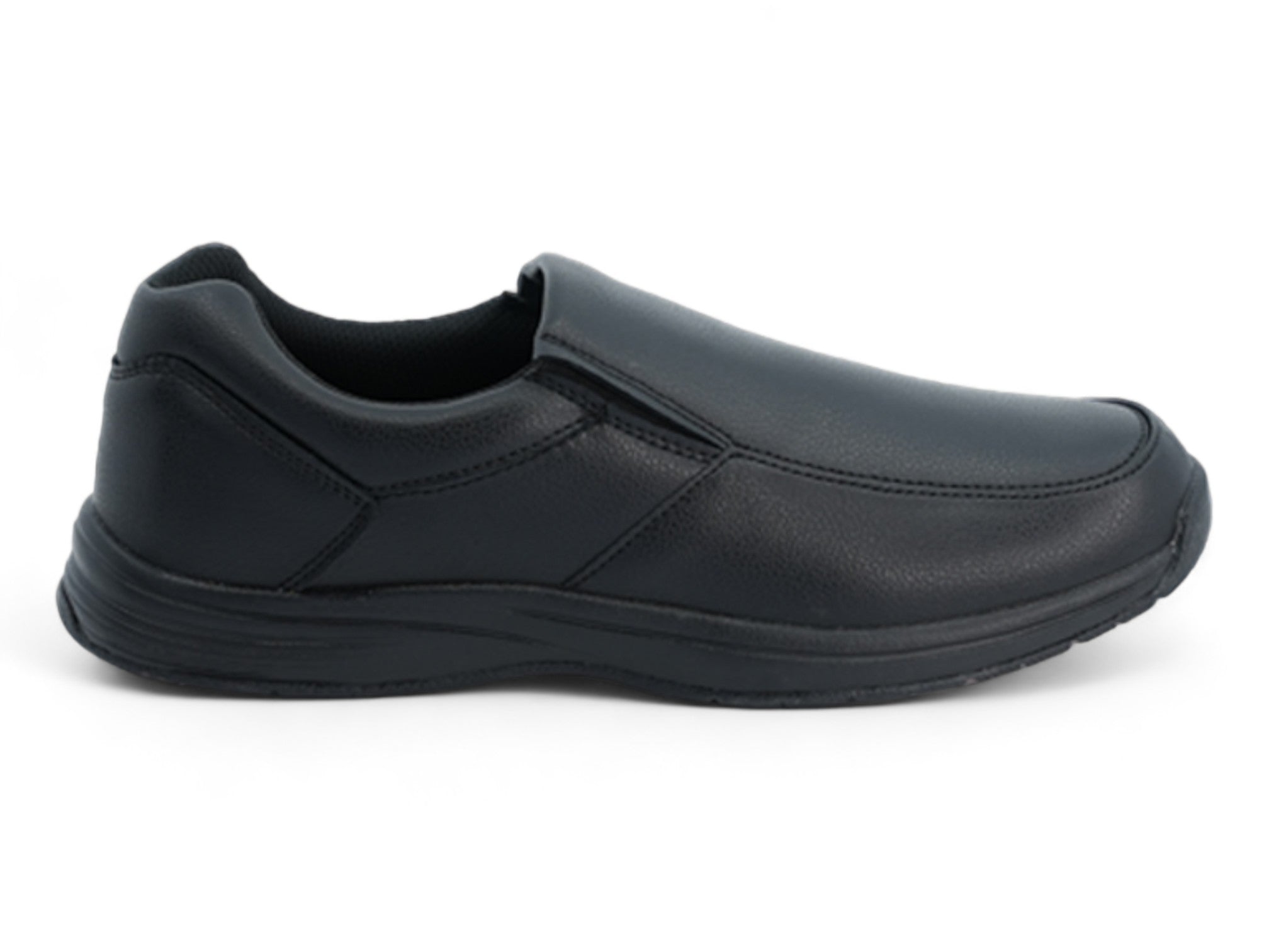 Disfruta de la comodidad y el estilo diarios con este zapato negro sin cordones para hombre, diseñado para ser fácil y versátil. Diseñado con una parte superior de cuero vegano negro suave y texturizado, ofrece un look moderno y minimalista, ideal tanto para entornos informales como profesionales.