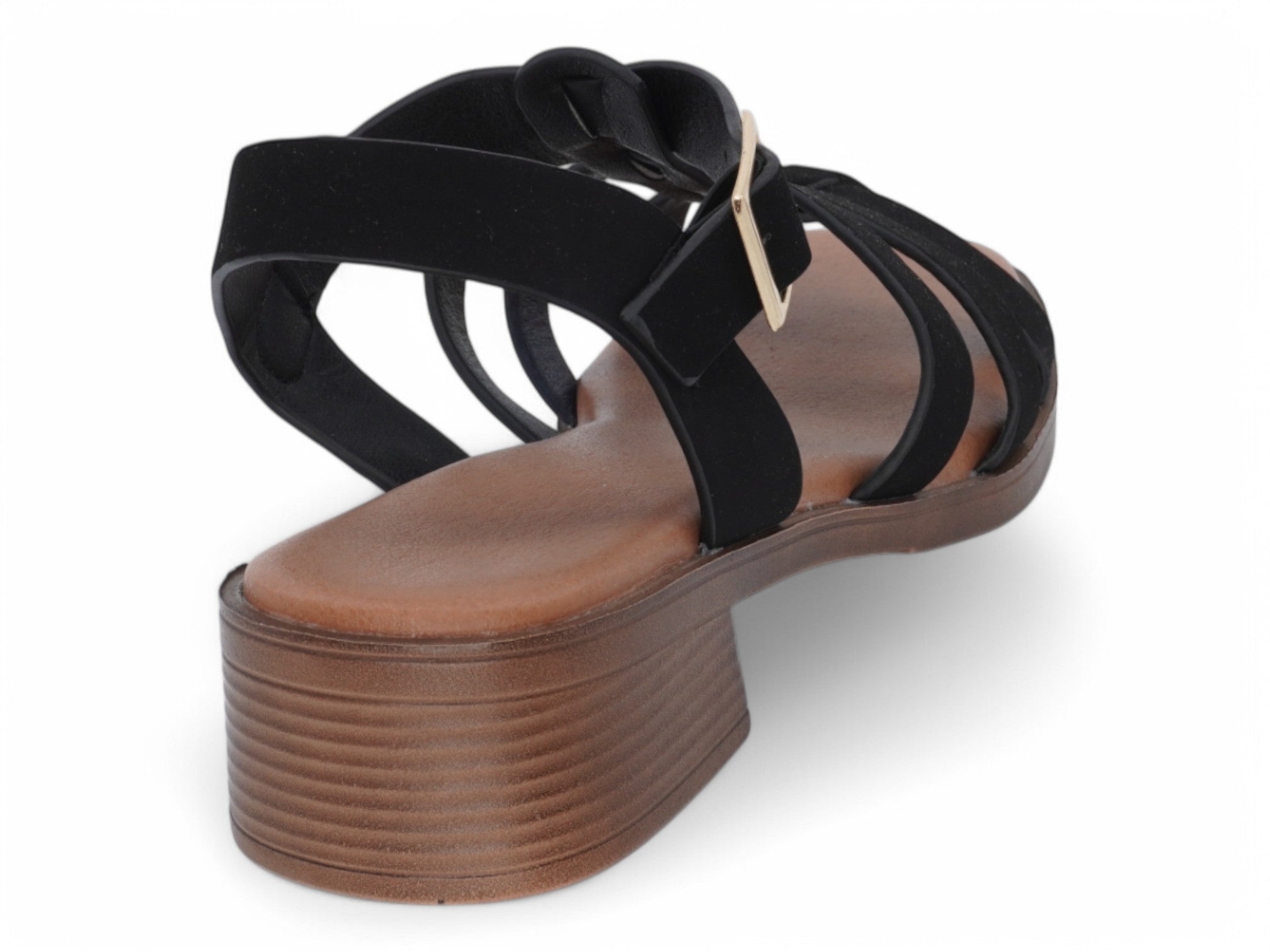 Luce un estilo sencillo y cómodo con esta sofisticada sandalia gladiadora negra para mujer. Elaborada en suave ante sintético negro, esta elegante sandalia presenta finas tiras y una correa de tobillo segura adornada con una brillante hebilla dorada para un look moderno y sofisticado.
