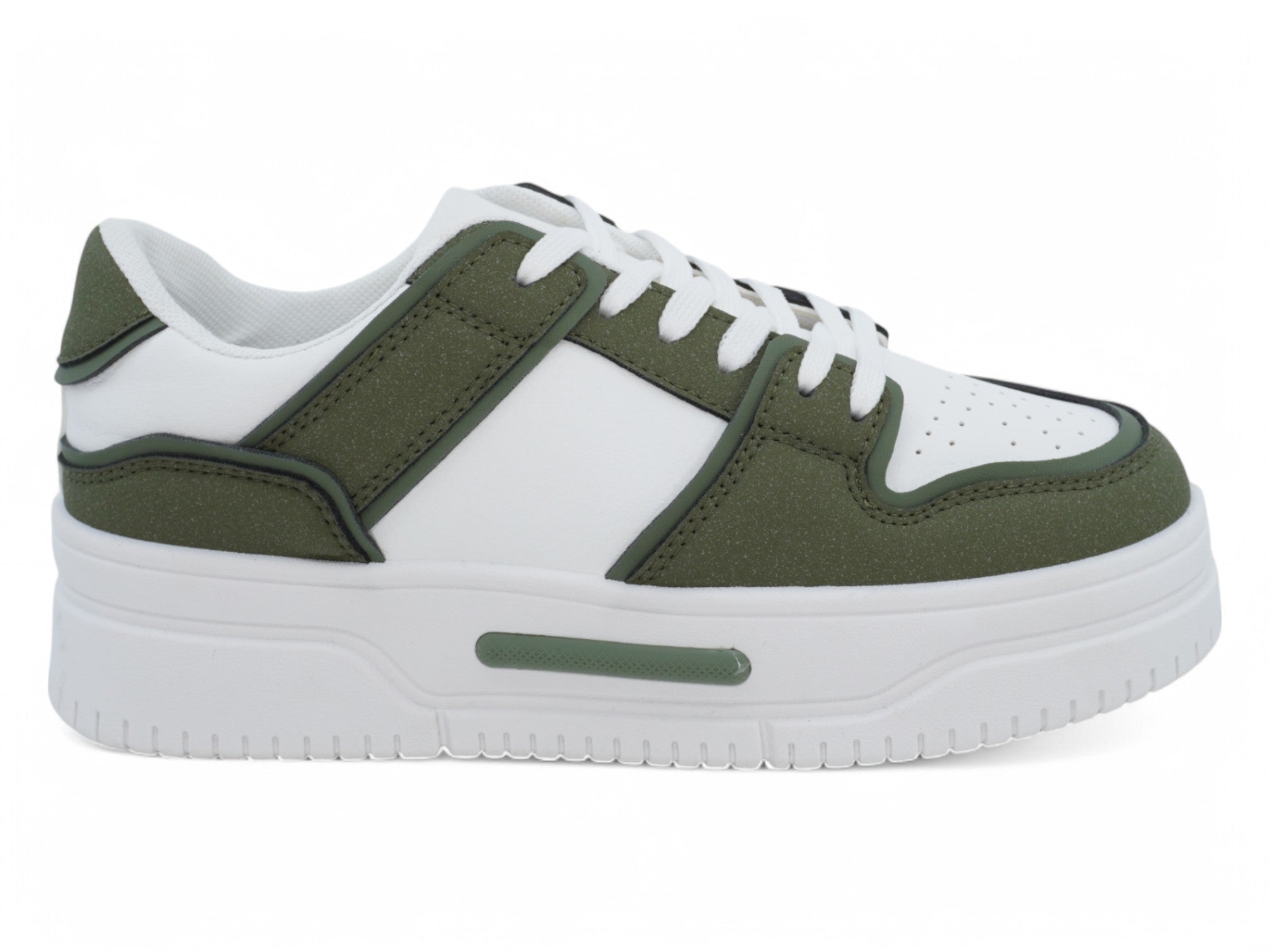 Luce un estilo sofisticado con las zapatillas de plataforma de ante verde y blanco para mujer, diseñadas para ofrecer comodidad y versatilidad. Estas elegantes zapatillas presentan una parte superior de ante sintético verde fresco con detalles de cuero vegano blanco impecable, creando un look bitono atemporal que combina a la perfección con cualquier look casual.