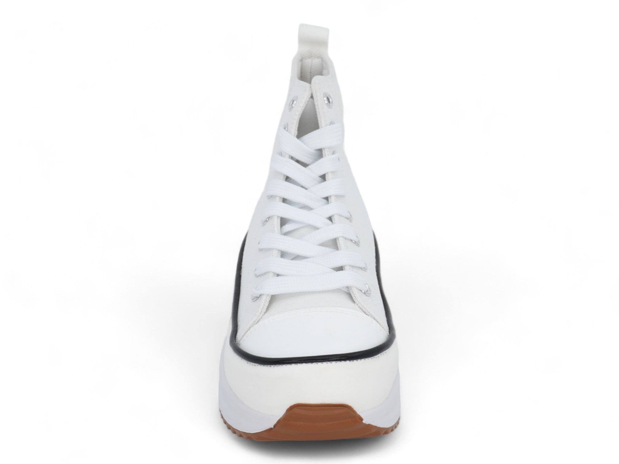 Mejora tu estilo diario con las zapatillas altas Simone blancas para mujer. Estas elegantes y modernas zapatillas altas presentan una parte superior de lona blanca impecable, un diseño clásico con cordones y sutiles costuras para un look impecable y versátil.