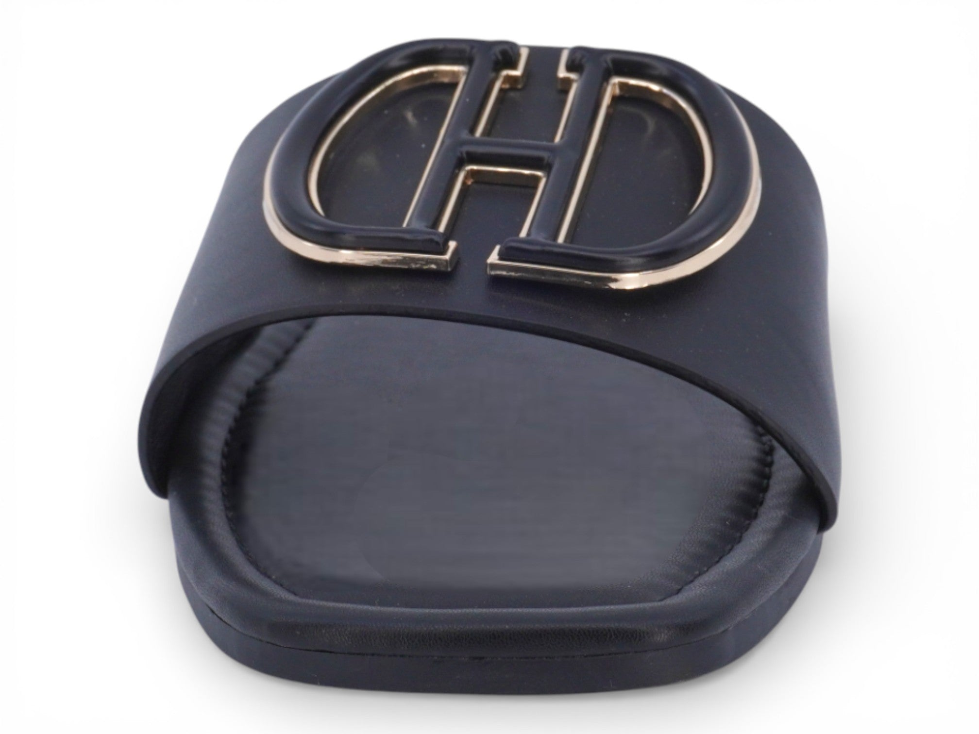 Luce un estilo desenfadado con la sandalia Jaida negra para mujer. Diseñada con sencillez y elegancia, esta chancla sin cordones presenta una elegante correa negra adornada con un llamativo emblema dorado, que añade un toque de sofisticación a tu look diario.