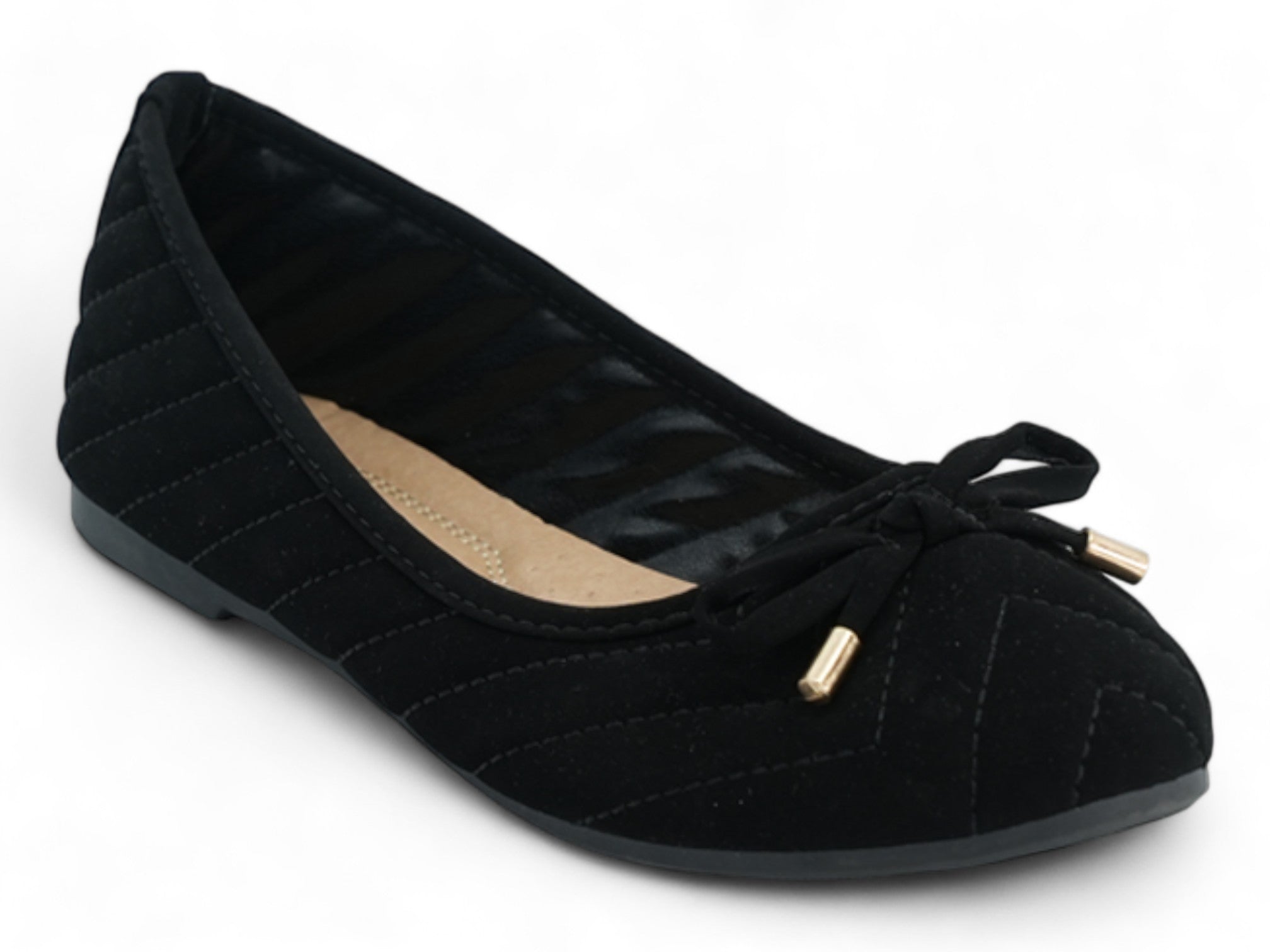 Luce un estilo desenfadado con las bailarinas Maya negras para mujer, un básico elegante para tu armario diario. Diseñadas con una elegante parte superior de ante sintético negro, estas bailarinas presentan un encantador patrón acolchado acentuado por sofisticadas costuras en zigzag. Un delicado lazo con detalles dorados le da un toque de refinamiento.
