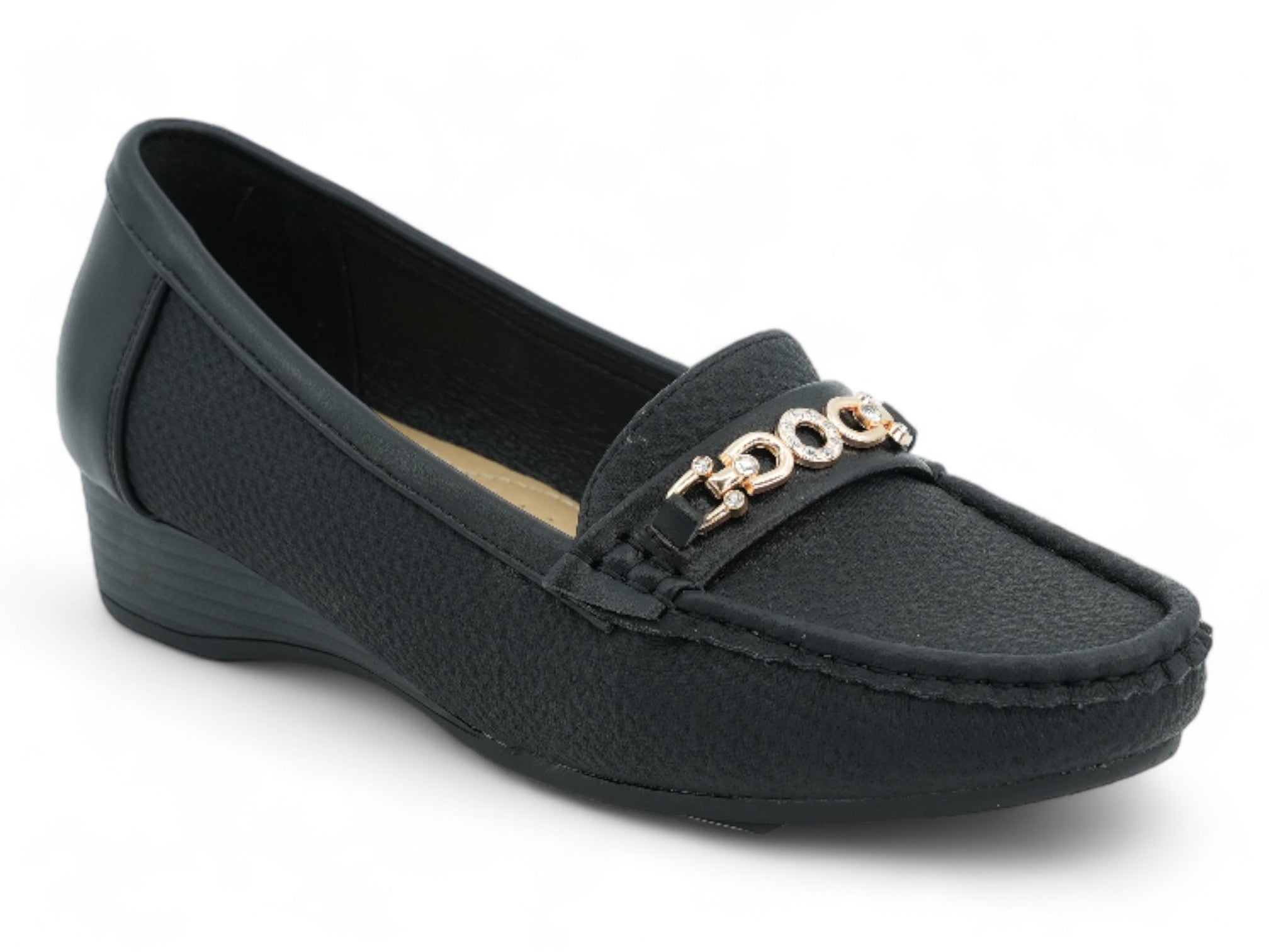 Sumérgete en la sofisticación atemporal con el mocasín Patricia negro para mujer. Este mocasín sin cordones combina la elegancia clásica con la comodidad diaria, convirtiéndolo en una adición versátil a cualquier armario. Su elegante parte superior negra se complementa con un elegante adorno metálico en la parte delantera, que le da el toque perfecto de elegancia a tu look.