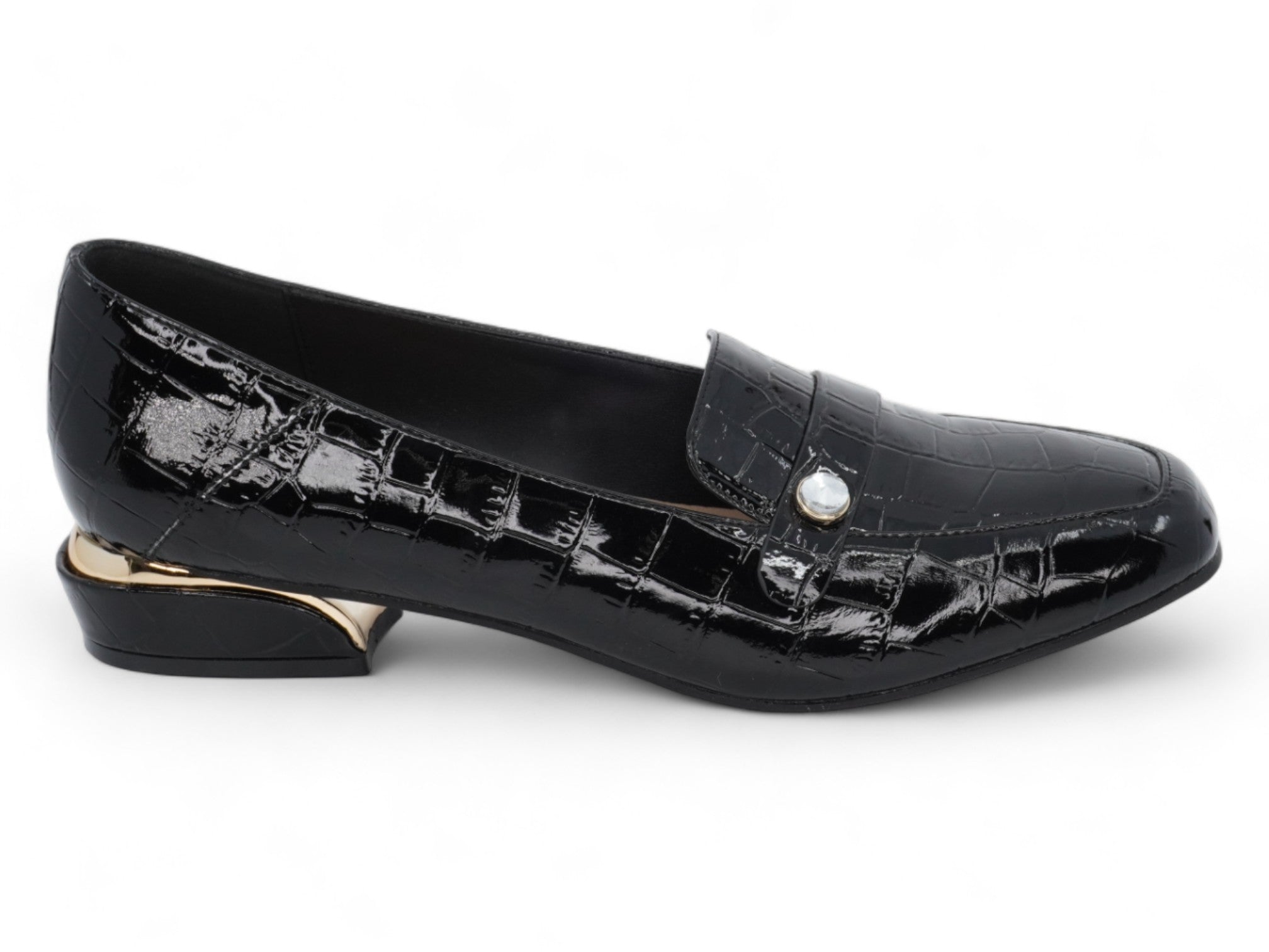 Sumérgete en la elegancia atemporal con el zapato de vestir ancho Alba negro para mujer, diseñado para aportar sofisticación y comodidad a cada paso. Este elegante mocasín presenta un lujoso acabado negro con textura de cocodrilo y un brillo satinado, convirtiéndolo en una incorporación destacada a tu elegante armario.