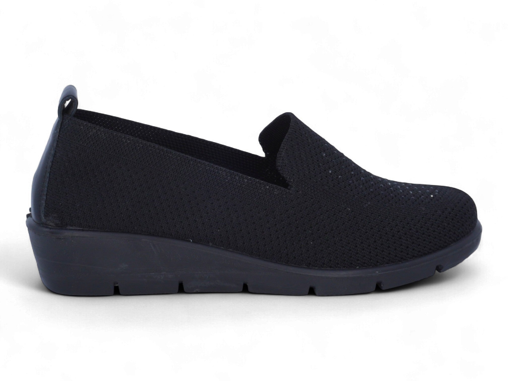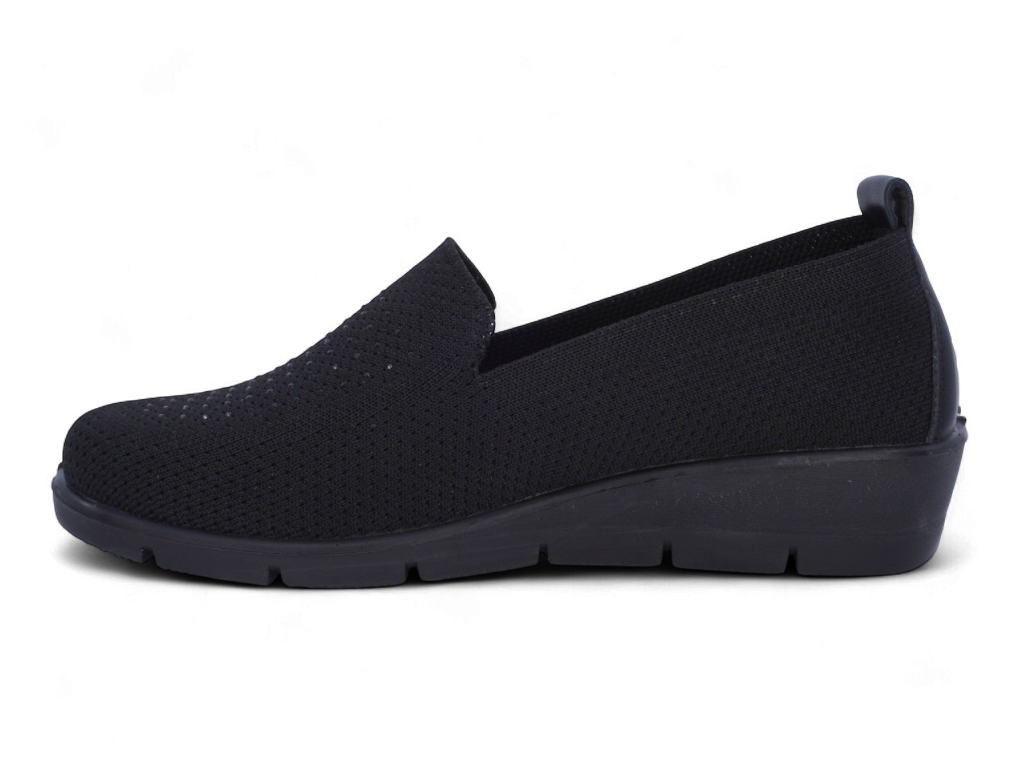 Luce un estilo relajado y cómodo con este zapato de cuña negro para mujer, diseñado para ofrecer un ajuste relajado y un toque chic. La parte superior texturizada de punto con vuelo está sutilmente decorada con brillantes diamantes de imitación, que añaden un toque de glamour a tu look diario.