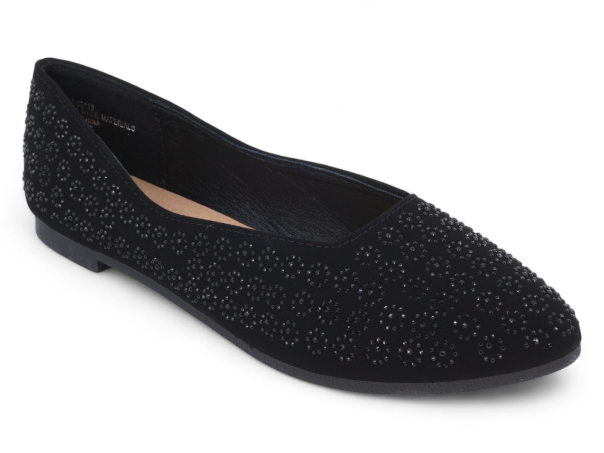 Luce una elegancia atemporal con el zapato plano Rylee negro para mujer, diseñado para realzar tu look diario sin esfuerzo. Fabricado en elegante ante sintético negro, este elegante zapato plano aporta un toque de sofisticación con su punta puntiaguda y deslumbrantes adornos de gemas circulares que le aportan un brillo sutil.