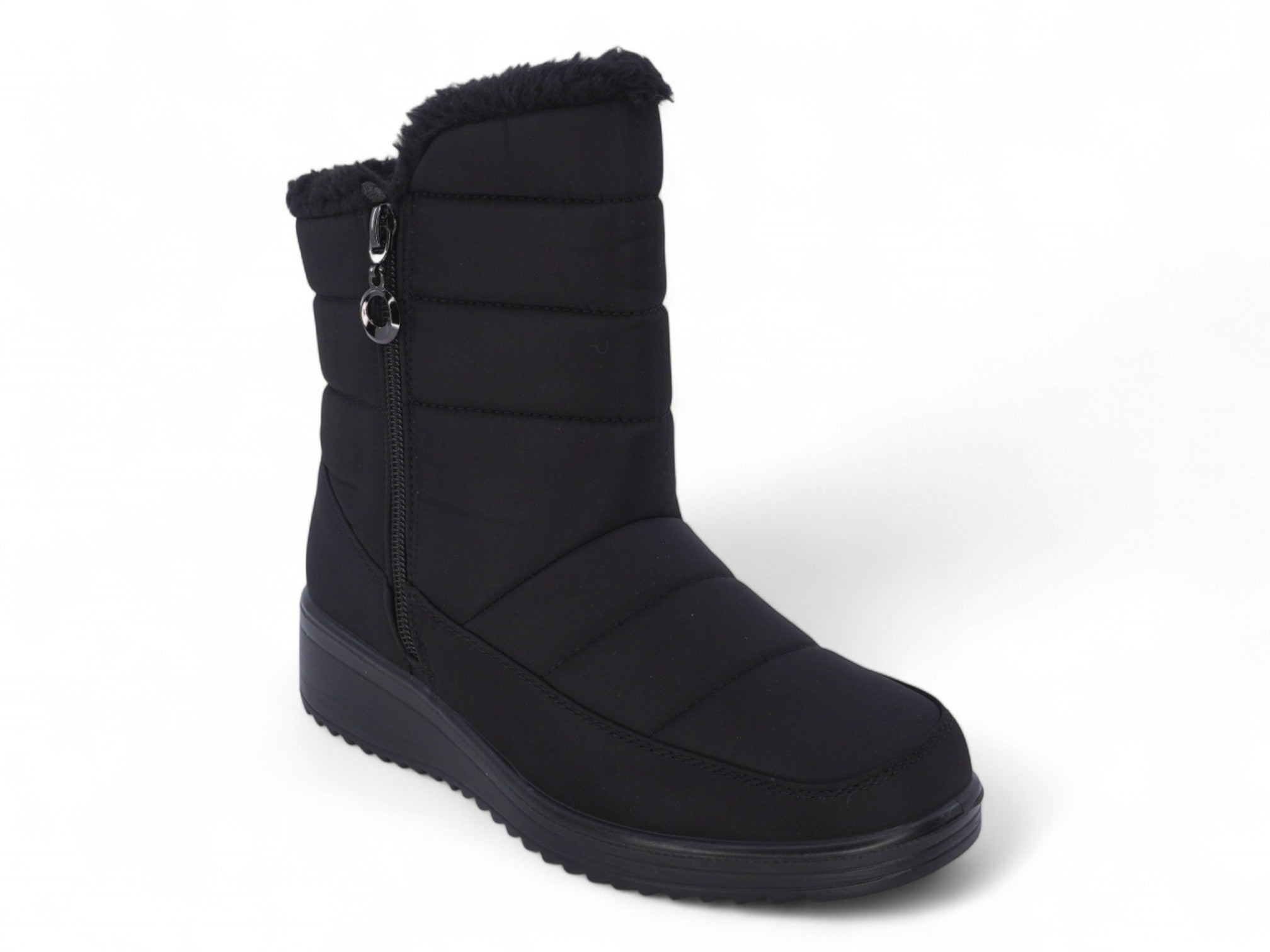 Entra en el invierno con confianza y comodidad con el botín ancho de nailon negro para mujer. Diseñado para los días más fríos, este botín cuenta con un exterior de nailon acolchado y un acogedor ribete de piel sintética en la parte superior, que ofrece calidez y estilo para la temporada.