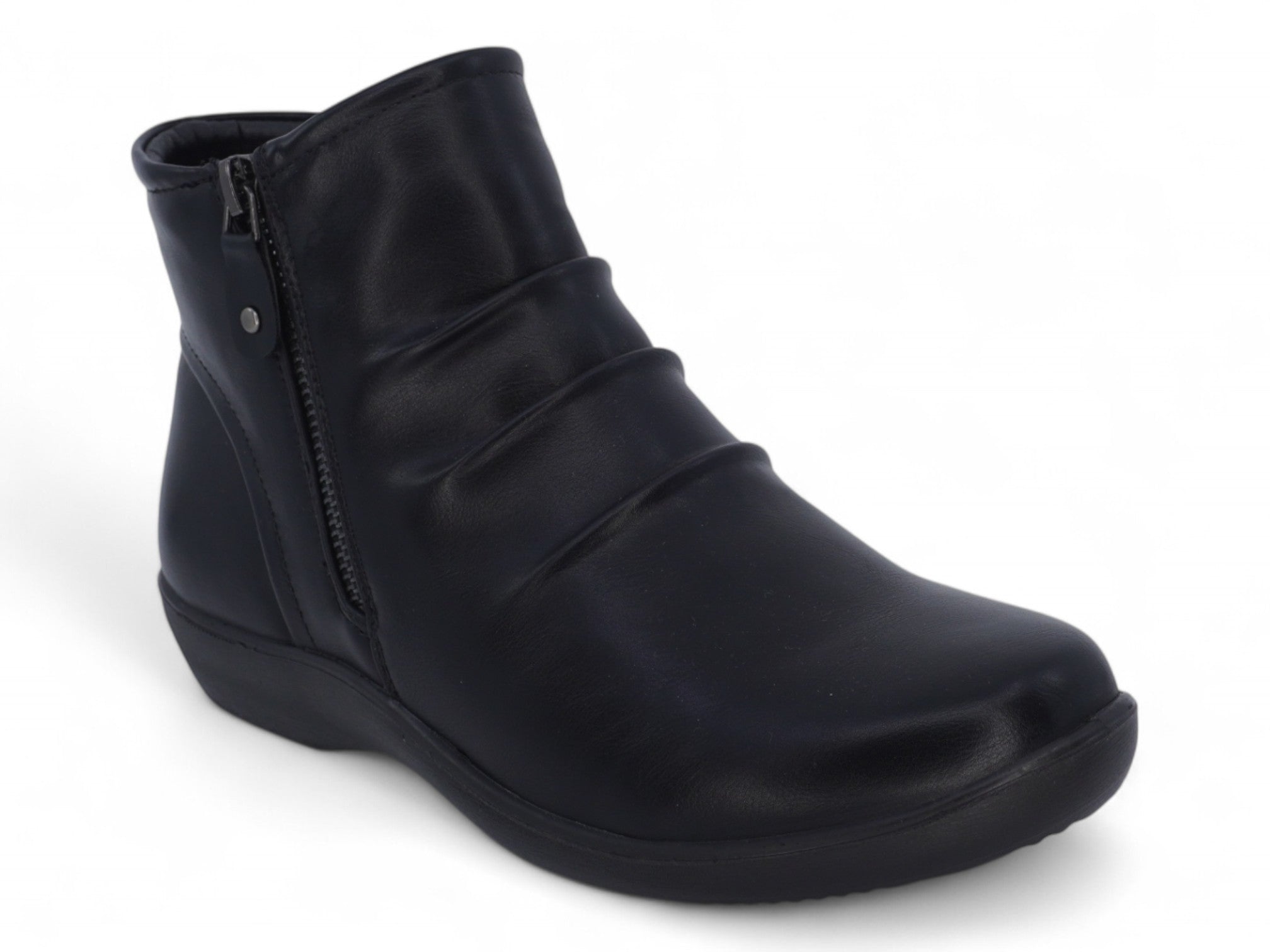 Entra con confianza en los días más frescos con el botín cómodo plisado de ancho ancho para mujer. Diseñado para ofrecer estilo y comodidad, este elegante botín negro presenta una clásica punta redondeada y una cremallera lateral de fácil acceso. La elegante parte superior está realzada con sutiles costuras plisadas, que le confieren un toque moderno y atemporal.