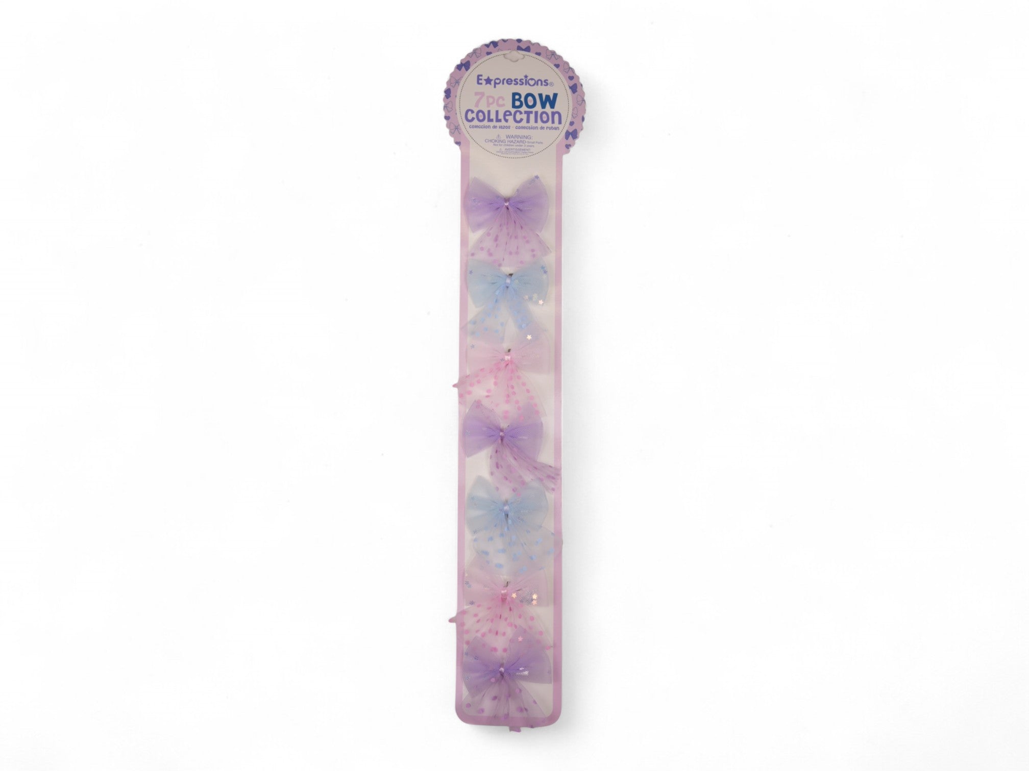 Dale un toque de fantasía a tus accesorios con la colección de 7 lazos Confetti. Este encantador set incluye siete lazos de colores pastel en suaves tonos rosa, morado y azul, cada uno adornado con encantadores estampados de lunares que le dan un toque divertido a cualquier look.