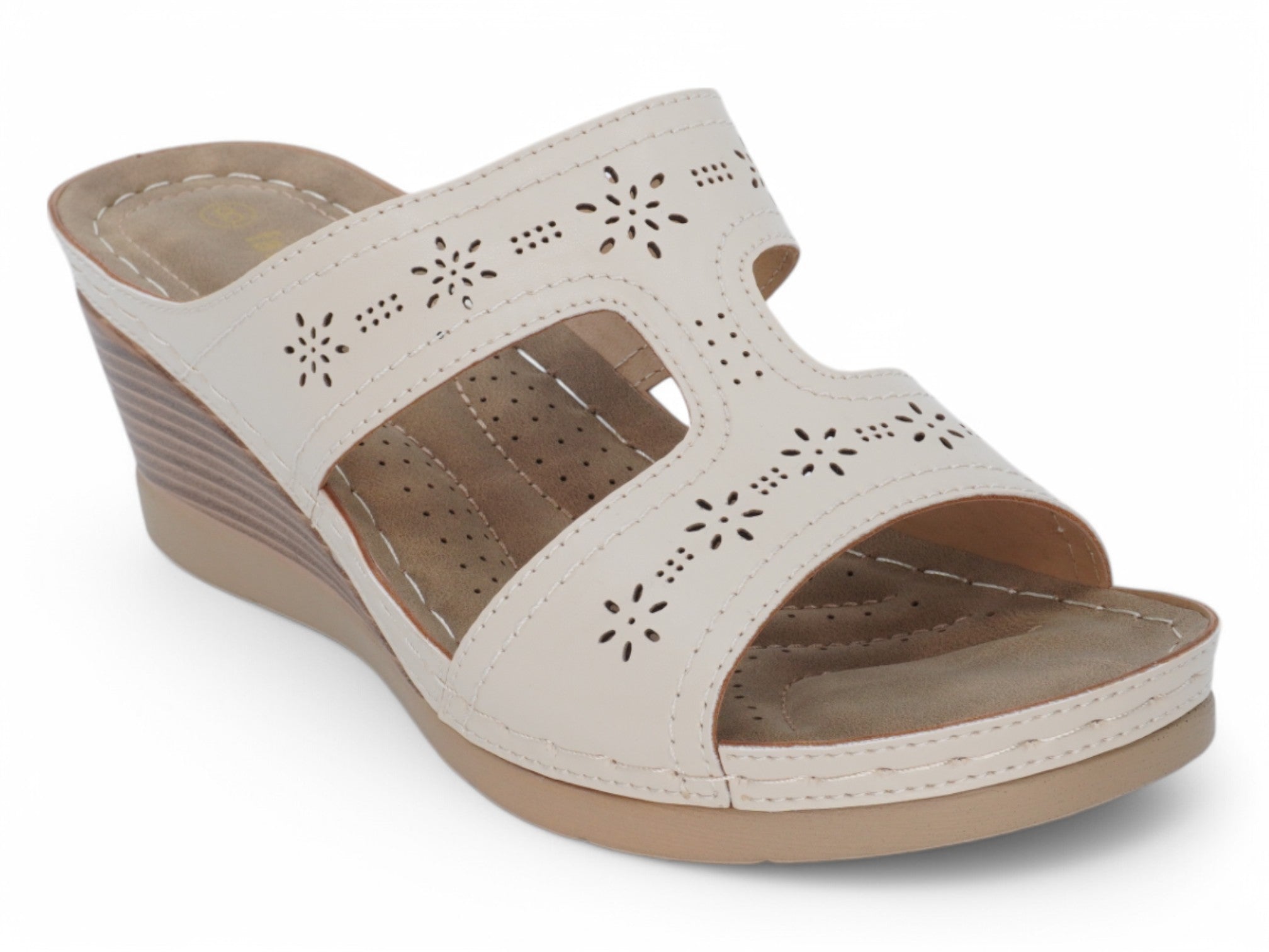 Adéntrate en la elegancia sin esfuerzo con la sandalia Libby Comfort para mujer en color marfil, diseñada para ofrecer estilo y comodidad. Con un diseño floral decorativo sobre tiras de suave piel vegana en color marfil, esta sandalia de cuña añade un toque elegante a tu armario para el verano. La cuña de 6,35 cm proporciona la elevación perfecta, perfecta para usar tanto de día como de noche.