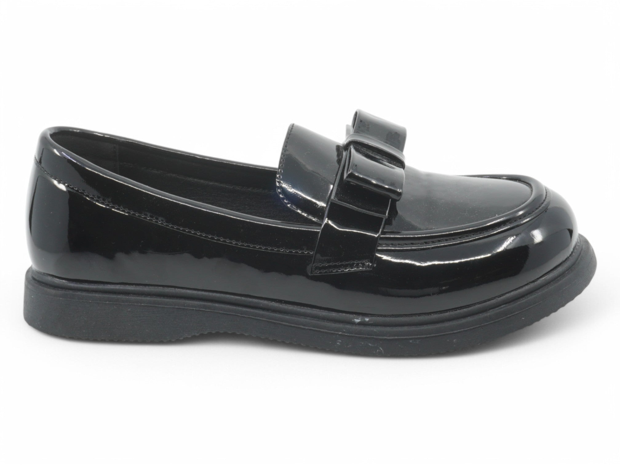 Add classic charm to her wardrobe with the Girls Black Patent Bow Flat Loafer. This polished shoe features a sleek, glossy black patent finish that delivers a timeless look perfect for schooldays, special occasions, or everyday wear.