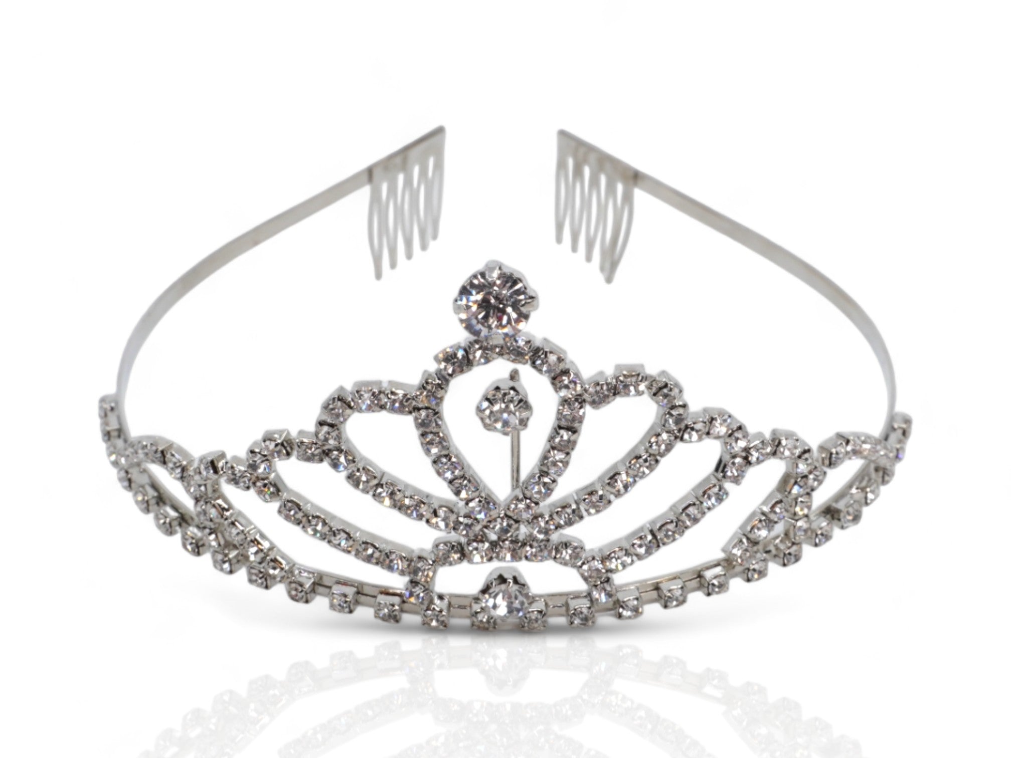 The tiara showcases a slightly higher central design, creating a classic silhouette perfect for weddings, proms, or pageants. It also features comb-like attachments on each side for a secure and comfortable fit throughout your event.